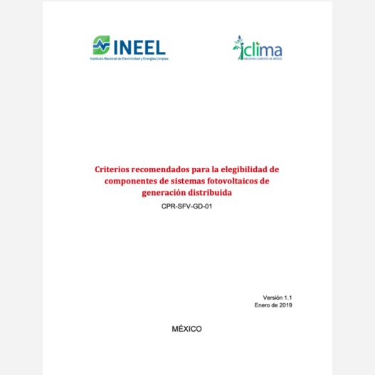 Este documento presenta un compendio de criterios recomendados para la elegibilidad de componentes principales de Sistemas Fotovoltaicos de Generación Distribuida (SFV-GD) 1 , con capacidad menor que 500 kW, para su aplicación en el contexto de México.